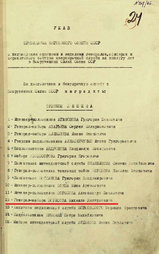 В прессе 1946 года указы о награждении Борисова не публиковались. Нет их и на сайте «Память народа». Но согласно данным того же ресурса, документы о награждении Борисова М.Д. после войны хранятся в Центральном архиве Министерства обороны Российской Федерации — ЦАМО. Поэтому мы обратились в главный военный архив страны с просьбой предоставить копии наградных документов Михаила Дмитриевича за 1946 год, а поддержал нас в этом деле депутат Государственного собрания – Курултая Республики Башкортостан Ильгам Галин.