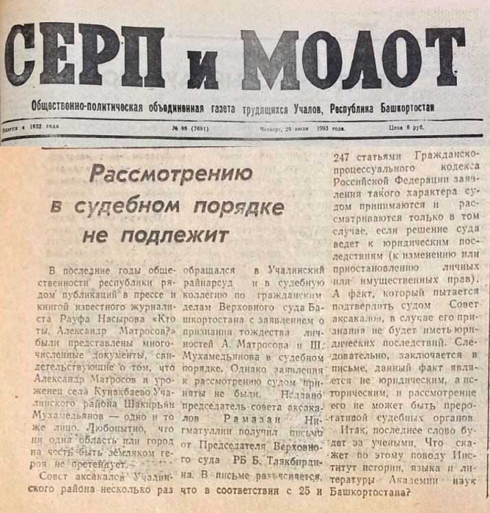 Существовавший в Учалах в 1990-е и начале 2000-х националистический «Совет аксакалов» несколько раз обращался в районный и Верховный суд Башкирии с требованиями «о признании тождества личностей А.Матросова и Ш.Мухамедьянова». Однако председатель ВC РБ Булат Тлякбирдин летом 1993 года сообщил руководителю «совета аксакалов» Рамазану Нигматуллину, сославшись на ГПК РФ, что подобного рода дела не подлежат рассмотрению в судебном порядке поскольку «не ведут к изменению или приостановлению личных или имущественных прав».