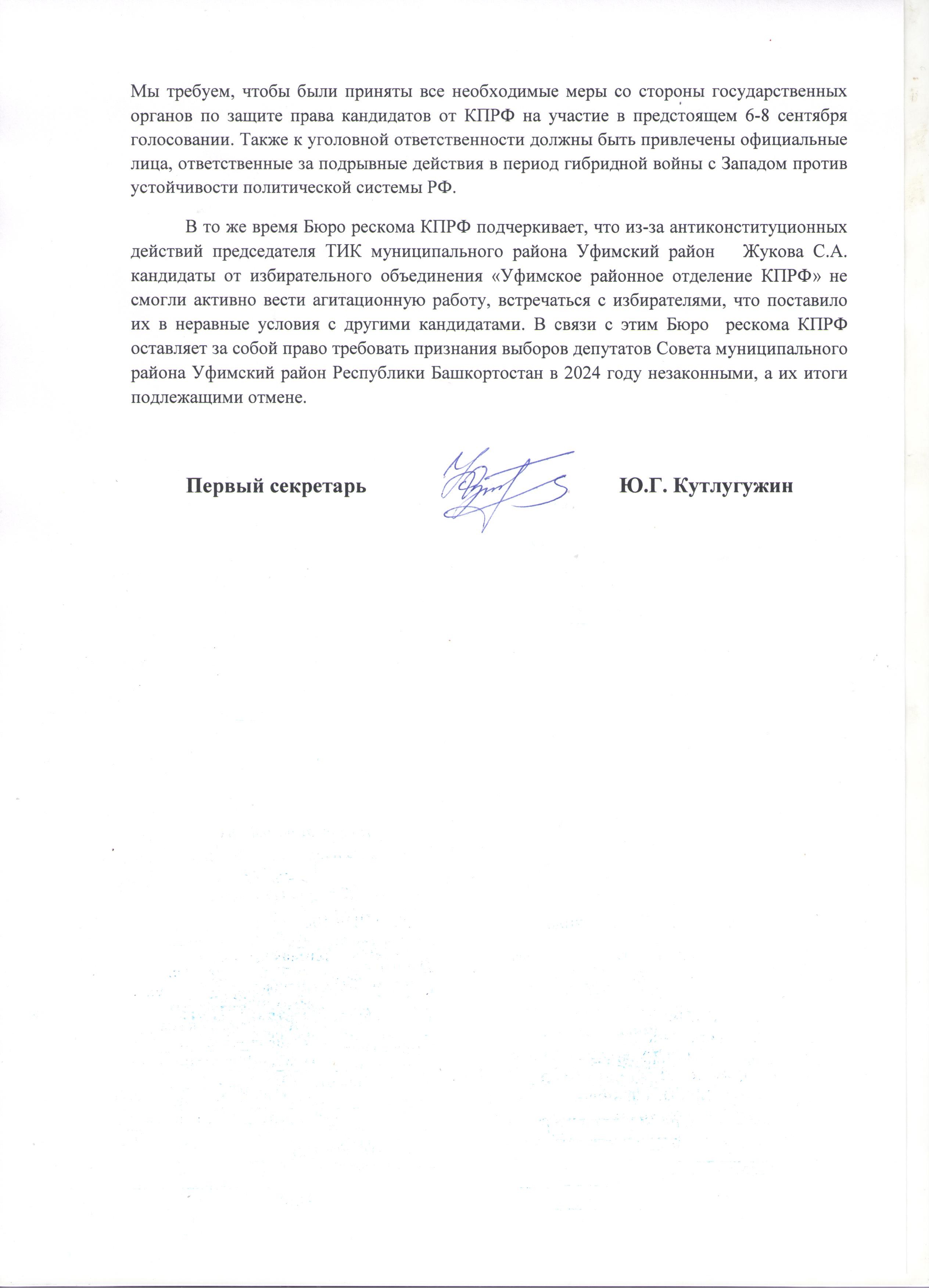 — В то же время Бюро рескома КПРФ подчеркивает, что из-за антиконституционных действий председателя ТИК муниципального района Уфимский район Жукова С.А.кандидаты от избирательного объединения «Уфимское районное отделение КПРФ» не смогли активно вести агитационную работу, встречаться с избирателями, что поставило их в неравные условия с другими кандидатами, — заявляют коммунисты. — В связи с этим Бюро рескома КПРФ оставляет за собой право требовать признания выборов депутатов Совета муниципального района Уфимский район Республики Башкортостан в 2024 году незаконными, а их итоги подлежащими отмене.