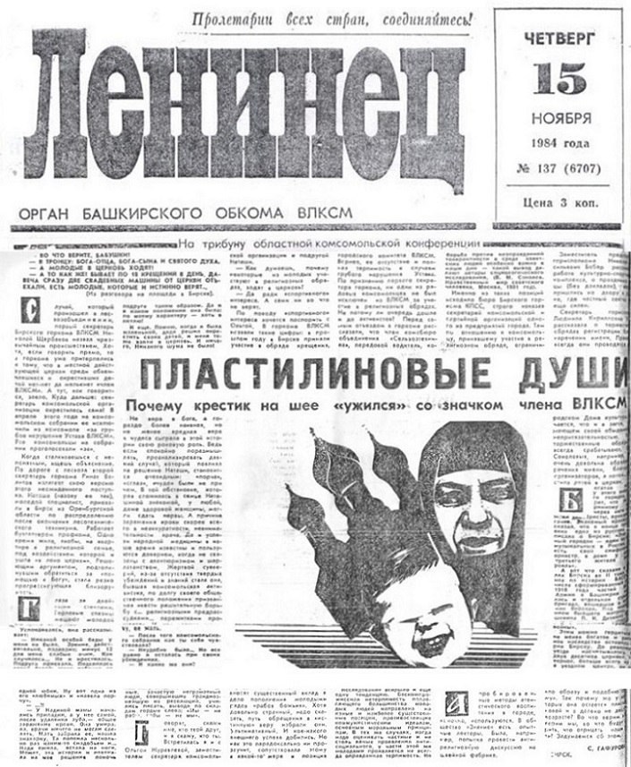 Девушку-инвалида по зрению, того самого секретаря первичной комсомольской организации лесхоза, исключили из комсомола, а потом высмеяли на всю Башкирию в газете «Ленинец» 15 ноября 1984 года в огромной статье «Пластилиновые души»: «Не отвратительно ли, не мерзко ли бывшему комсомольскому активисту опуститься до звания «рабы божьей?». Автор материала – С.Гафурова.