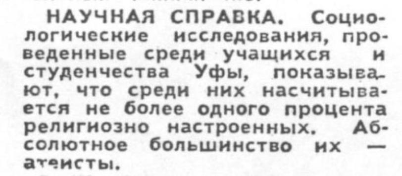 Круги от «пасхальной» демонстрации долго не давали покоя обкомовскому начальству, и 18 сентября 1984 года на IV пленуме обкома Мидхат Шакиров потребовал от своих подчиненных, чтобы те контролировали религиозные взгляды граждан от рождения до самой смерти «последовательно и непрерывно, на протяжении всех этапов жизненного пути человека». А 11 января 1986 года республиканская пресса, целенаправленно вернувшись к событиям в Бирске, опубликовала некие «научные справки», сопровождаемые пространными комментариями доцентов от атеизма. Согласно одной из них, в Башкирии, якобы, насчитывается не более одного процента религиозно настроенных студентов, а по другой — из общего числа религиозных людей «65-70 процентов ни разу не были в театре, филармонии, на спортивных соревнованиях», плохо участвуют в рационализаторской и изобретательской работе и даже …не ходят на собрания.