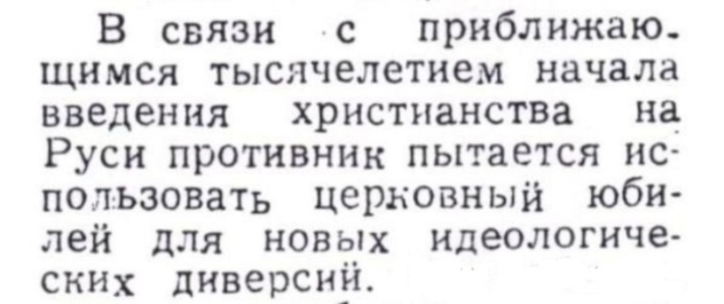 — В связи с приближающимся тысячелетием начала введения христианства на Руси противник пытается использовать церковный юбилей для новых идеологических диверсий, — нагнетал психоз на XXXVIII областной партконференции 17 января 1986 года «товарищ» Шакиров.