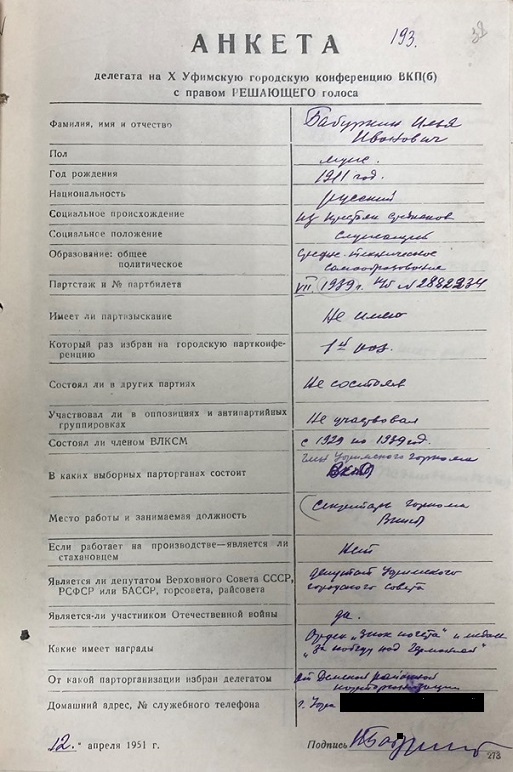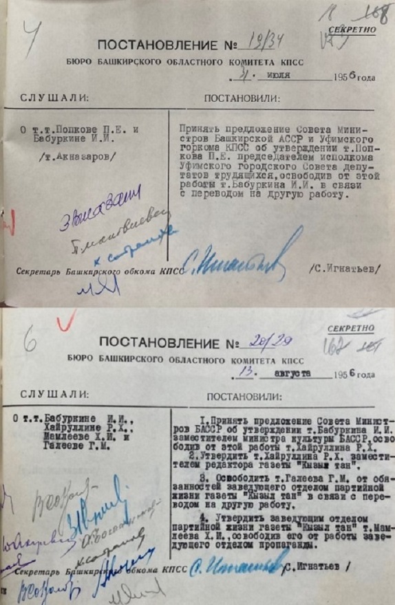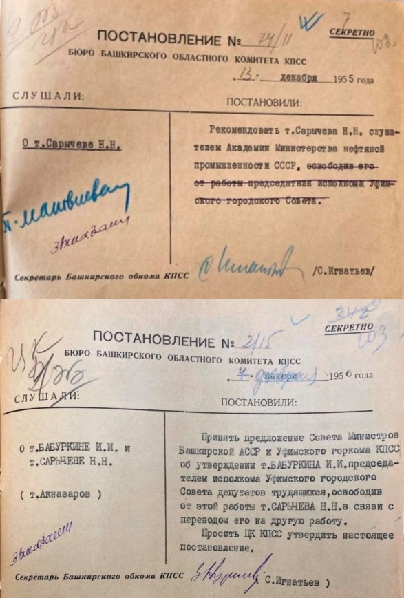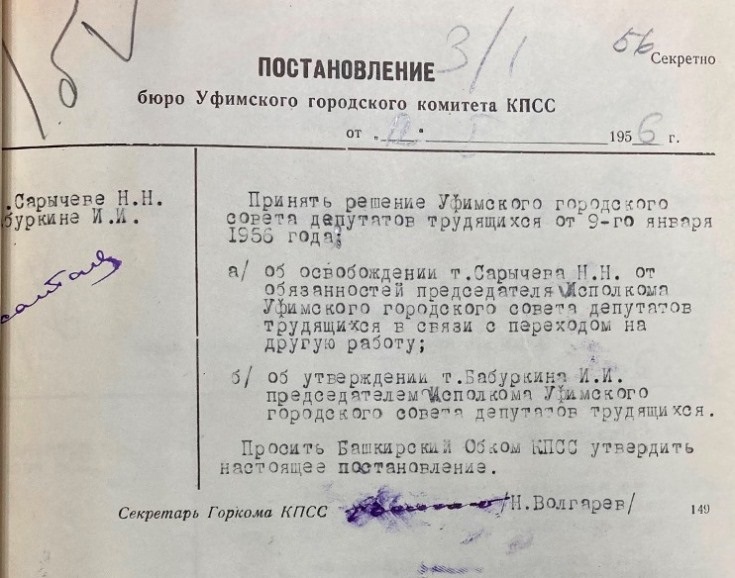 И все же из доступных документов мы установили, что смещение Николая Сарычева происходило в страшной спешке в режиме спецоперации. До 3 декабря 1955 года, когда открыла свою работу XIV Уфимская городская партконференция, на которую прибыли Семен Игнатьев, Зия Нуриев, Зекерия Акназаров и предсовмина БАССР Валей Набиуллин, Сарычев, даже не знал о своей предстоящей отставке и замене на Бабуркина. Тот не был делегатом конференции, а присутствовал в качестве приглашенного, и тем ни менее, его избирают сначала в состав горкома, а потом неожиданно для всех, членом бюро, где он занял квоту председателя горисполкома.