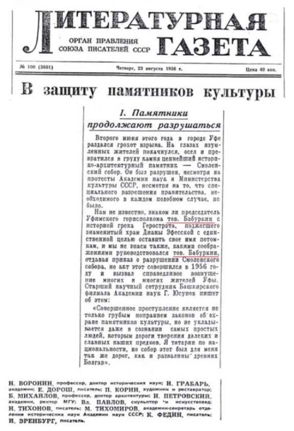 23 августа 1956 года «Литературная газета» опубликовала протест против взрыва Смоленского собора – Троицкой церкви в Уфе, подписанный писателями Ильей Эринбургом, Николаем Тихоновым, Константином Фединым, академиками Игорем Грабарем и другими.