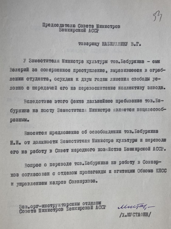 Но недавно в материалах Национального архива мы натолкнулись на любопытные документы. Оказывается, сын «уфимского Герострата» Ильи Бабуркина — Валерий ограбил в 1960 году студента: «Осужден к двум годам лишения свободы с передачей его на перевоспитание коллективу завода».
