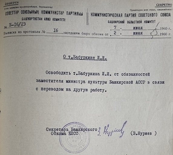 Вскоре состоялось объединение Уфы и Черниковска. Илье Ивановичу должностей в новых органах городской власти не нашлось. Не зря Ищериков назвал его «халифом на час». Окончательную отставку Бабуркина оформили 31 июля 1956 года, когда его уволили «в связи с переводом на другую работу». Но номенклатура «халифа» не сдала, и вскоре он, всплыл …заместителем министра культуры БАССР.