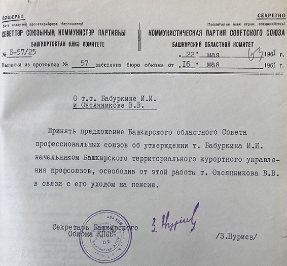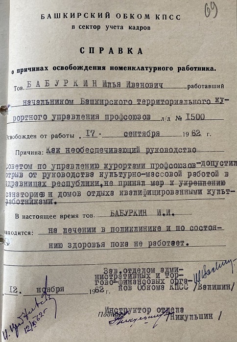После этого Илья Иванович потерял пост зам. министра. Но система его не сдала, а Вагапов снова помог. Бабуркина назначили зам. начальника центрального бюро технической информации Башсовнархоза, а менее чем через год последовал новый взлет, когда он стал начальником Башкирского территориального курортного управления профсоюзов.