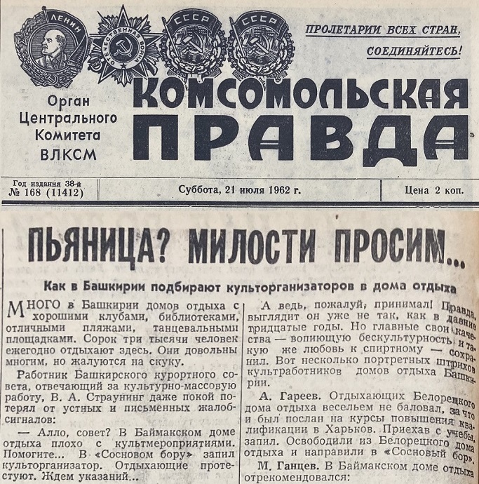 Оказывается, в подведомственных Бабуркину домах отдыха республики процветало пьянство, регулярно возникали драки и только в Уфимском доме отдыха за один месяц под суд попало двенадцать (!) дебоширов.