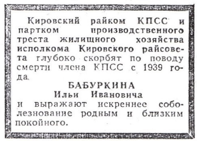 И только через месяц — 3 февраля 1986 года «Вечерняя Уфа» опубликовала небольшое стандартное сообщение о том, что Кировский райком КПСС и партком ПТЖХ Кировского райисполкома «глубоко скорбят по поводу смерти члена КПСС с 1939 года Бабуркина Ильи Ивановича».