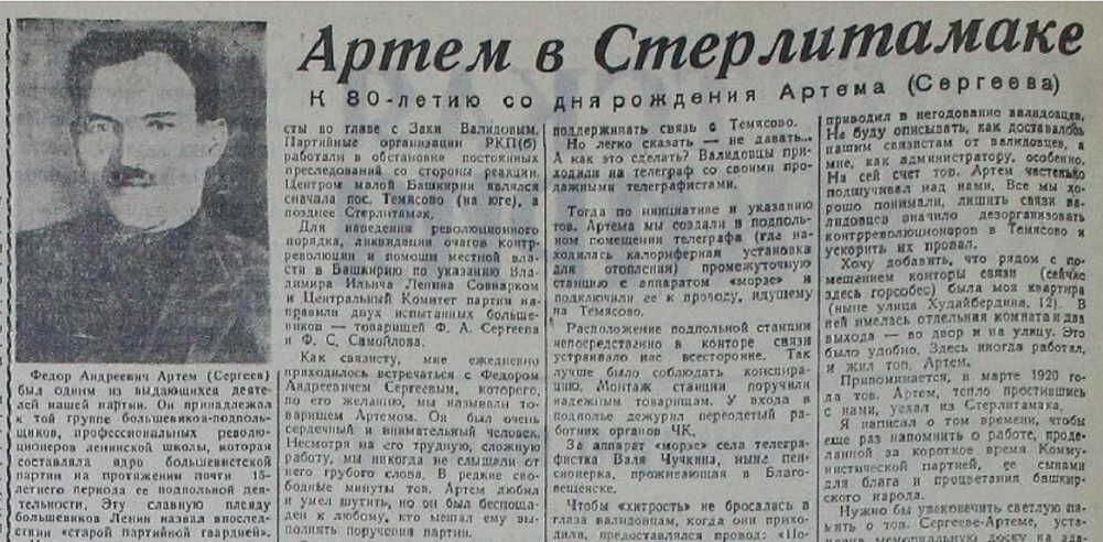 Артём имел непосредственное отношение и к нашей республике, когда по заданию Ленина 14 декабря 1919 года он прибыл в Стерлитамак.