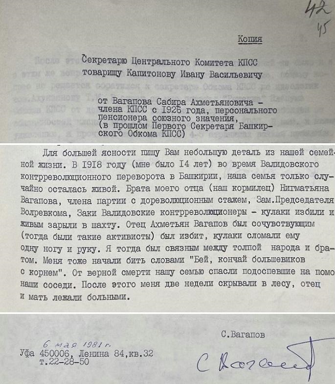 6 мая 1981 года бывший первый секретарь Башкирского обкома КПСС Сабир Вагапов письменно обратился к секретарю ЦК КПСС Ивану Капитонову. Заявление Вагапова имело сугубо личный характер и основного его содержания мы касаться не будем. Но один фрагмент обращения имеет непосредственное отношение к нашей теме.