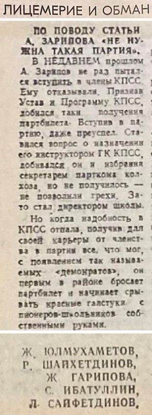 А ещё 28 марта 1992 года бывшие однопартийцы Алима Бариевича в материале «Лицемерие и обман» рассказали со страниц учалинской районной газеты «Серп и молот» (сейчас это «Учалинская газета» — Авт.), как тот будучи директором Ильчинской средней школы, первым в районе — 12 июля 1990 года выбросил партбилет и собственноручно стал срывать с пионеров красные галстуки.