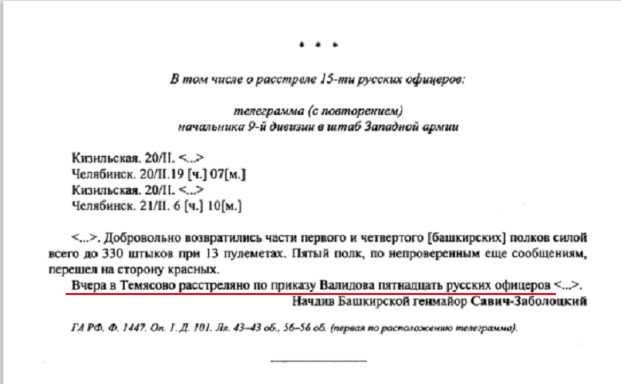 Набивая себе цену перед новыми союзниками и выторговывая амнистию, Валидов 19 февраля 1919 года приказал расстрелять 15 русских офицеров, служивших в его «войске». Нынешние апологеты Ахмет-Заки очень не любят вспоминать эту расправу по национальному признаку, но есть подтверждающий документ, опубликованный профессором Билалом Юлдашбаевым.
