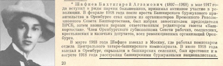 В 1918 году валидовцы казнили интернационалиста Бахтигарея Шафиева, в честь которого названа улица в Уфе. Сейчас же поклонники Валидова уверяют, что того убили русские белогвардейцы, а коммуниста Шафиева записали …националистом.