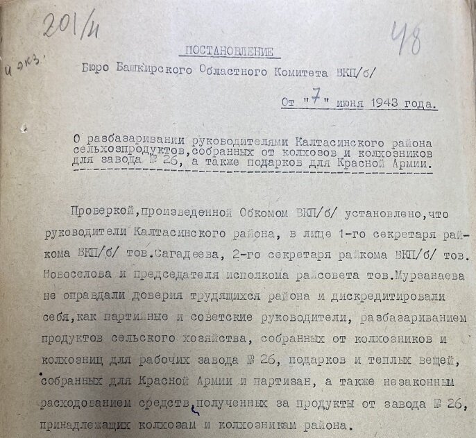 А ещё 7 июня 1943 года Бюро Башкирского обкома ВКП (б) приняло постановление «О разбазаривании руководителями Калтасинского района сельхозпродуктов, собранных от колхозов и колхозников для завода № 26, а также подарков для Красной Армии», в котором отмечалось, что руководители Калтасинского района в лице первого секретаря райкома Сагадеева, второго секретаря Новоселова и председателя исполкома райсовета Мурзанаева «не оправдали доверия трудящихся района и дискредитировали себя как партийные и советские руководители».