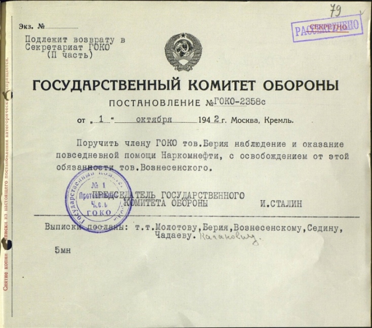 Об остроте ситуации в нефтяной отрасли говорит появление 1 октября 1942 года постановления Государственного комитета обороны № ГОКО-2358с о поручении «тов. Берия наблюдения и оказания повседневной помощи Наркомнефти». Второй человек в стране, стал напрямую руководить отраслью в оперативном режиме, разбирался и вникал в каждую мелочь. Активно привлекал для этого аппарат НКВД.