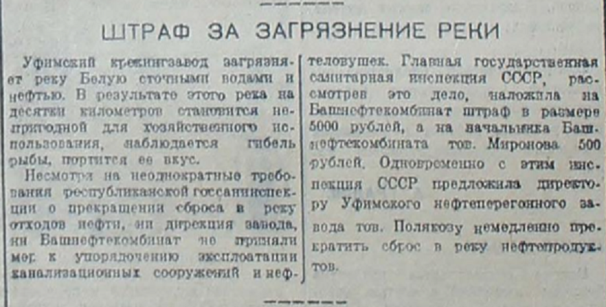 И Уфимский НПЗ к началу войны подошел в неприглядном состоянии. Даже примитивный нефтяной амбар так и не выкопали и при авариях нефтепродукты продолжали сливать в Белую. Заметку об этом мы нашли в «Красной Башкирии» за 15 мая 1941 года.