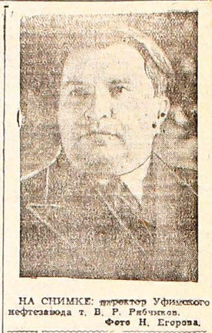 Заботился о людях. Во всяком случае голодных смертей на рабочих местах во время войны на УНПЗ не было. Рябчикова даже хвалили со страниц «Красной Башкирии». Между тем, директоров тогда обычно ругали. «Расшивал» узкие места, а в 1945 году даже заасфальтировал и озеленил территорию предприятия. Завод стал приобретать цивилизованный вид.
