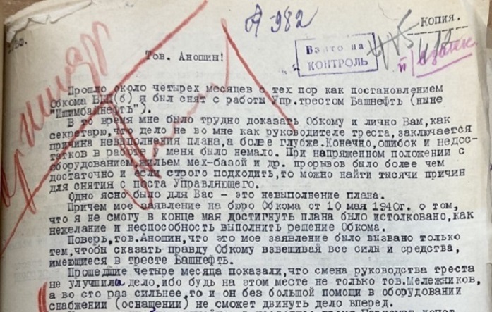 Это письмо первому секретарю Башкирского обкома ВКП (б) Ивану Аношину от бывшего управляющего трестом «Башнефть» Алексея Акулинина, датированное 7 октября 1940 года.