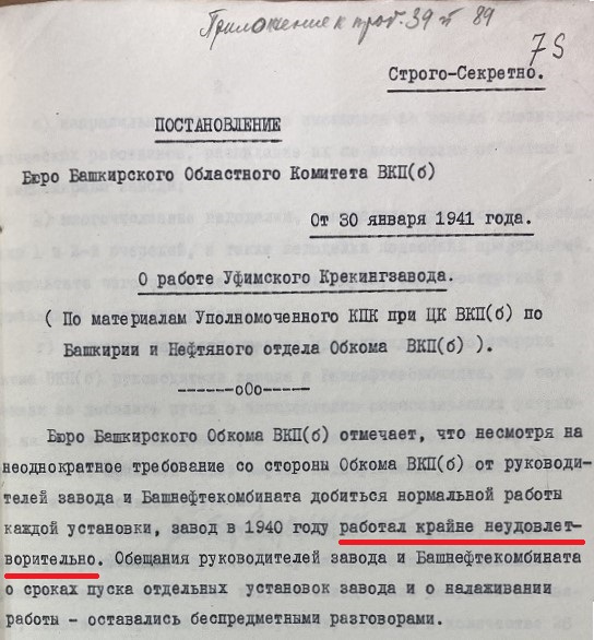«Бюро Башкирского обкома ВКП (б) отмечает, что завод в 1940 году работал крайне неудовлетворительно. Обещания руководителей завода и Башнефтекомбината о сроках пуска отдельных установок и о налаживании работы – оставались беспредметными разговорами».