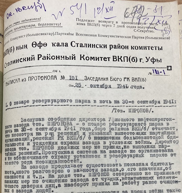 Во время Великой Отечественной войны нефтепереработчики столицы Башкирии своим героическим трудом обеспечивали горючим Красную армию и народное хозяйство страны. УНПЗ располагался в глубоком тылу, был недосягаем для вражеской авиации и, казалось, ему ничего не угрожало. Однако самоуспокоенность тогдашнего руководства дорого обошлась стратегическому предприятию, когда на нем в последний день сентября 1941 года была совершена диверсия. Удивительно, но этот драматический факт ни разу не освещался в СМИ республики и в исторической литературе региона.