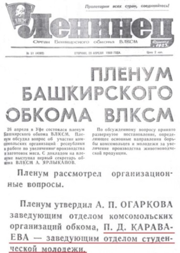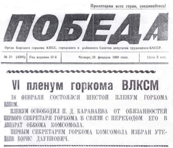 Первым секретарем бирского горкома комсомола в 1967-м состоял Петр Караваев, сын зампреда райисполкома Дмитрия Караваева.