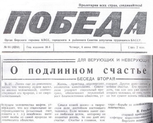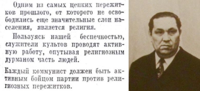 А 7 декабря 1971 года мракобес похвалился в «Победе» тем, что у детей, порвавших под его влиянием с религией …«взгляд стал живей, походка увереннее».