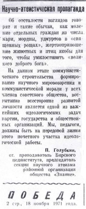 А Петр Голубкин в период перестройки перекрасился в специалиста «по этнографии и истории дохристианских верований восточных марийцев». Но предавать забвению оперативно-розыскную деятельность этого мракобеса среди детей нельзя. Хотя бы для того, чтобы подобное не повторилось ещё раз.