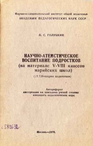 Для чего применил собственную методику, по которой в 1971 году защитил кандидатскую диссертацию по теме «Научно-атеистическое воспитание подростков (на материале V-VIII классов марийских школ)» в НИИ общей педагогики АПН СССР.