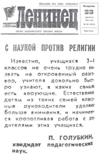 — Известно, учащихся 3-4 классов не очень трудно вызвать на откровенный разговор, учителя довольно быстро узнают, в каких семьях есть верующие, — инструктировал он учителей перед августовским педсоветом со страниц «Ленинца» в 1983 году.