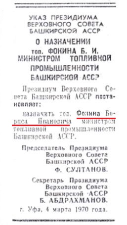 Заслуги Бориса Ивановича не забыли, и 4 марта 1970 года назначили министром топливной промышленности БАССР. Он получил квартиру в номенклатурном доме в центре Уфе и все полагавшиеся льготы и привилегии.