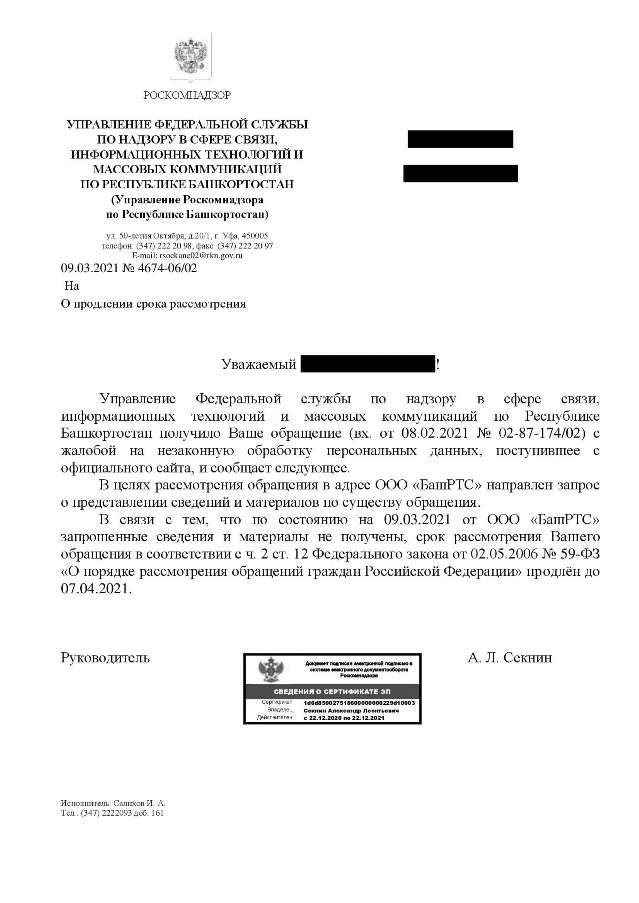Прошел установленный законом срок – 30 дней и уфимец получил ответ, в котором говориться, что «в целях рассмотрения обращения в адрес ООО «БашРТС» направлен запрос о представлении сведений и материалов по существу обращения». Однако, «в связи с тем, что по состоянию на 09.03.2021 от ООО «БашРТС» запрошенные сведения и материалы не получены, срок рассмотрения Вашего обращения в соответствии с ч. 2 ст. 12 Федерального закона от 02.05.2006 № 59-ФЗ «О порядке рассмотрения обращений граждан Российской Федерации» продлён до 07.04.2021».